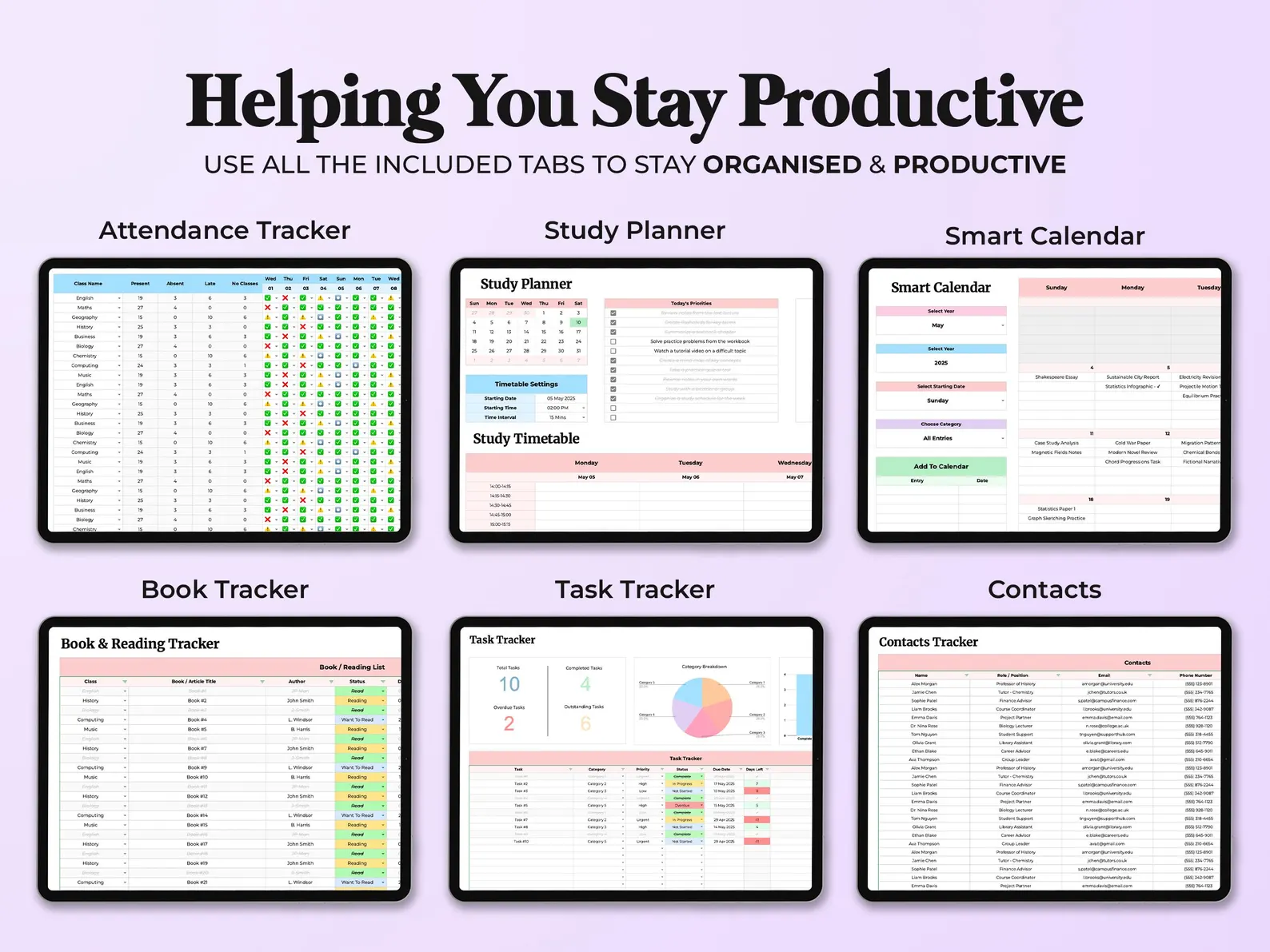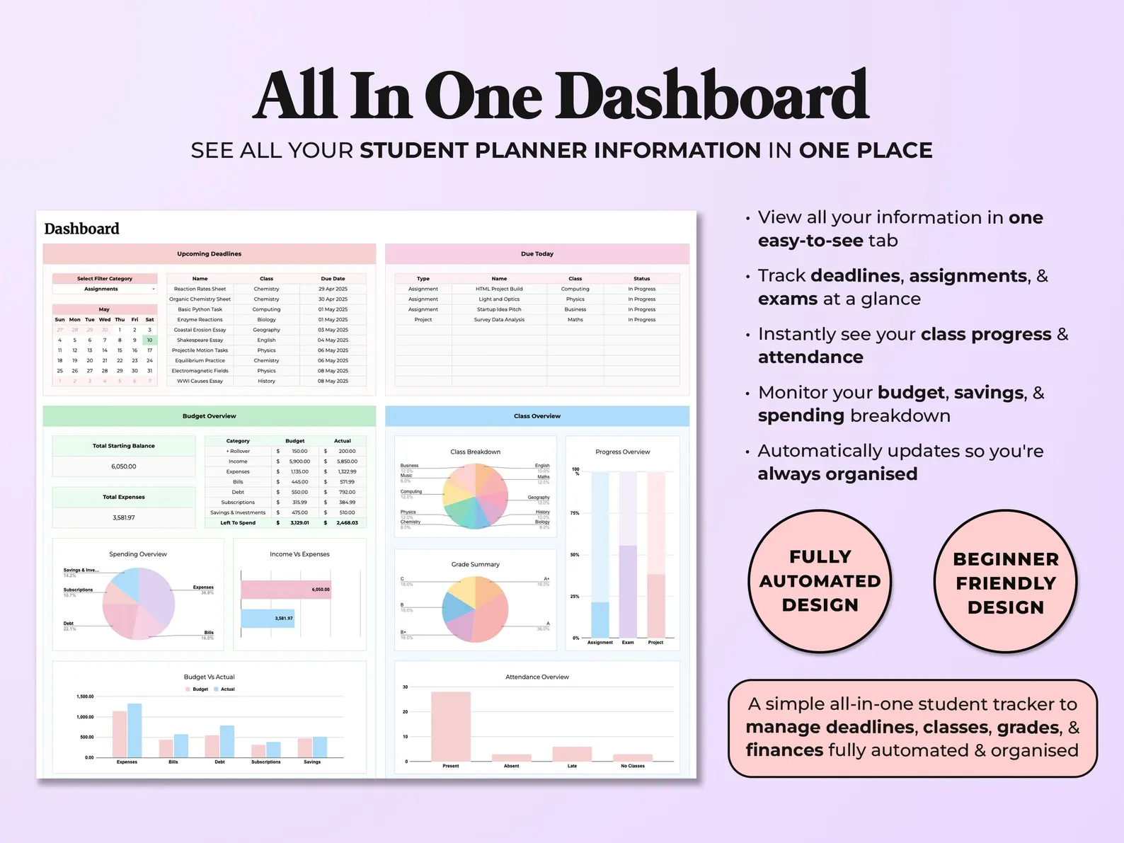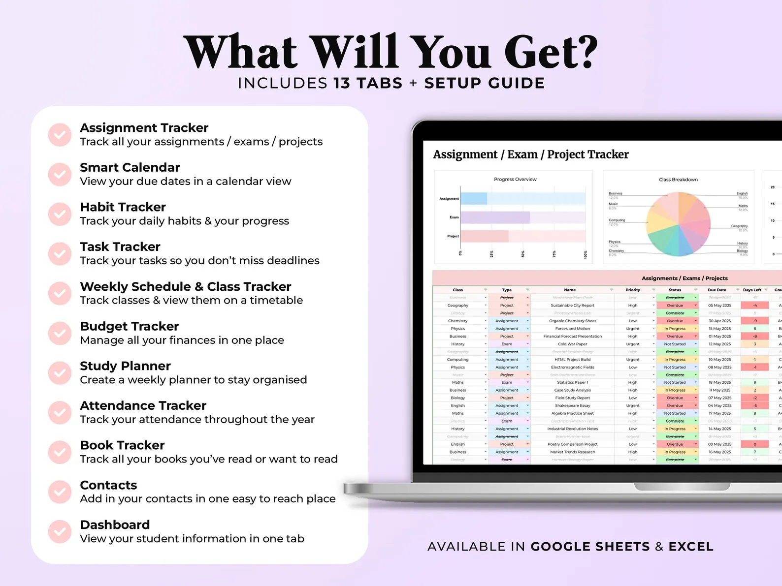 Academic Student Planner Spreadsheet School Assignment Tracker Google Sheets Excel College Study Planner Template University Class Planner